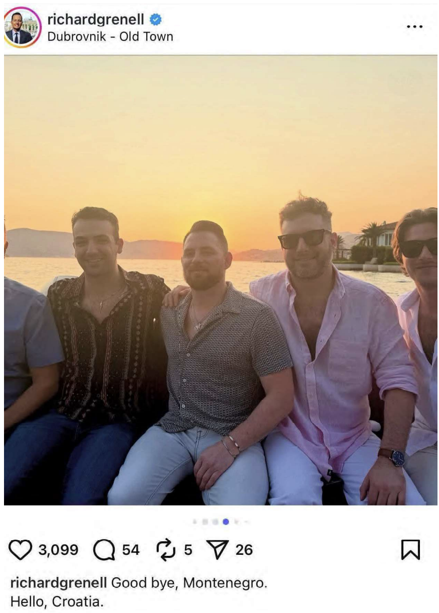 Some of those enjoying the expense account at the Kennedy Center have previously appeared on Ric Grenell's instagram, including on a trip to Montenegro and Croatia, including (second from left) Nick Meade and second from right Rick Loughery. (RichardGrenell/Instagram) |